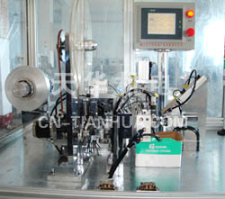 Brief introduction of machine purpose capacitance deflector automatic separater is the special automated equipment. in the capacitance industry, which the deflector and the aluminum foil weld automatically, and cut off the flanging. Besides rolled in aluminum foil and copper tape installed on the machine manually, other action of the machine are controlled by PLC automatically. This machine can achieve a series of actions of such as delivering,cutting off the copper deflector, letting-out,drawstring, cutting off, flanging the aluminum foil automatically, supersonic welding of the copper tape strip and the aluminum foil, the cupule loading the material and the turnplate changing the material automatically.The whole actions of this machine are linked up and fluency.Have such characters as follows: 1. High degree of automatization , safe, reliable and convinient of the operation, one person can operate many machines. 2.Suitable for many kinds of specification of the aluminum foil width within 20-80mm 3.Adjustable of the cut-off length of the metal strap.